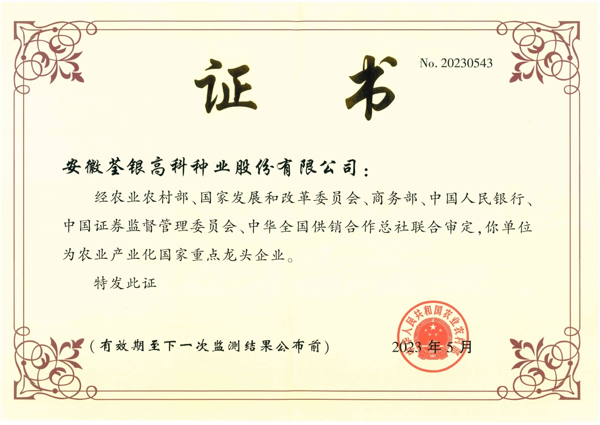 安徽荃銀高科種業(yè)股份有限公司是一家“以種業(yè)為核心、農(nóng)業(yè)服務(wù)為延伸、探索和創(chuàng)新農(nóng)業(yè)多元化發(fā)展”的現(xiàn)代高科技種業(yè)上市公司,證券代碼:300087。公司注冊(cè)資金9.47億元,系“中國(guó)種業(yè)領(lǐng)軍企業(yè)、農(nóng)業(yè)產(chǎn)業(yè)化國(guó)家重點(diǎn)龍頭企業(yè)、國(guó)家高新技術(shù)企業(yè)、農(nóng)業(yè)部首批農(nóng)作物種子育繁推一體化企業(yè)、中國(guó)種業(yè)信用明星企業(yè)"。在國(guó)內(nèi)控股子公司20多家,在國(guó)外設(shè)立分支機(jī)構(gòu)4家,良種銷售至全國(guó)20多個(gè)?。ㄊ?、區(qū)),出口覆蓋20多個(gè)國(guó)家與地區(qū),種業(yè)綜合實(shí)力、雜交水稻研發(fā)、推廣及海外業(yè)務(wù)規(guī)模均居全國(guó)種子企業(yè)前2位。